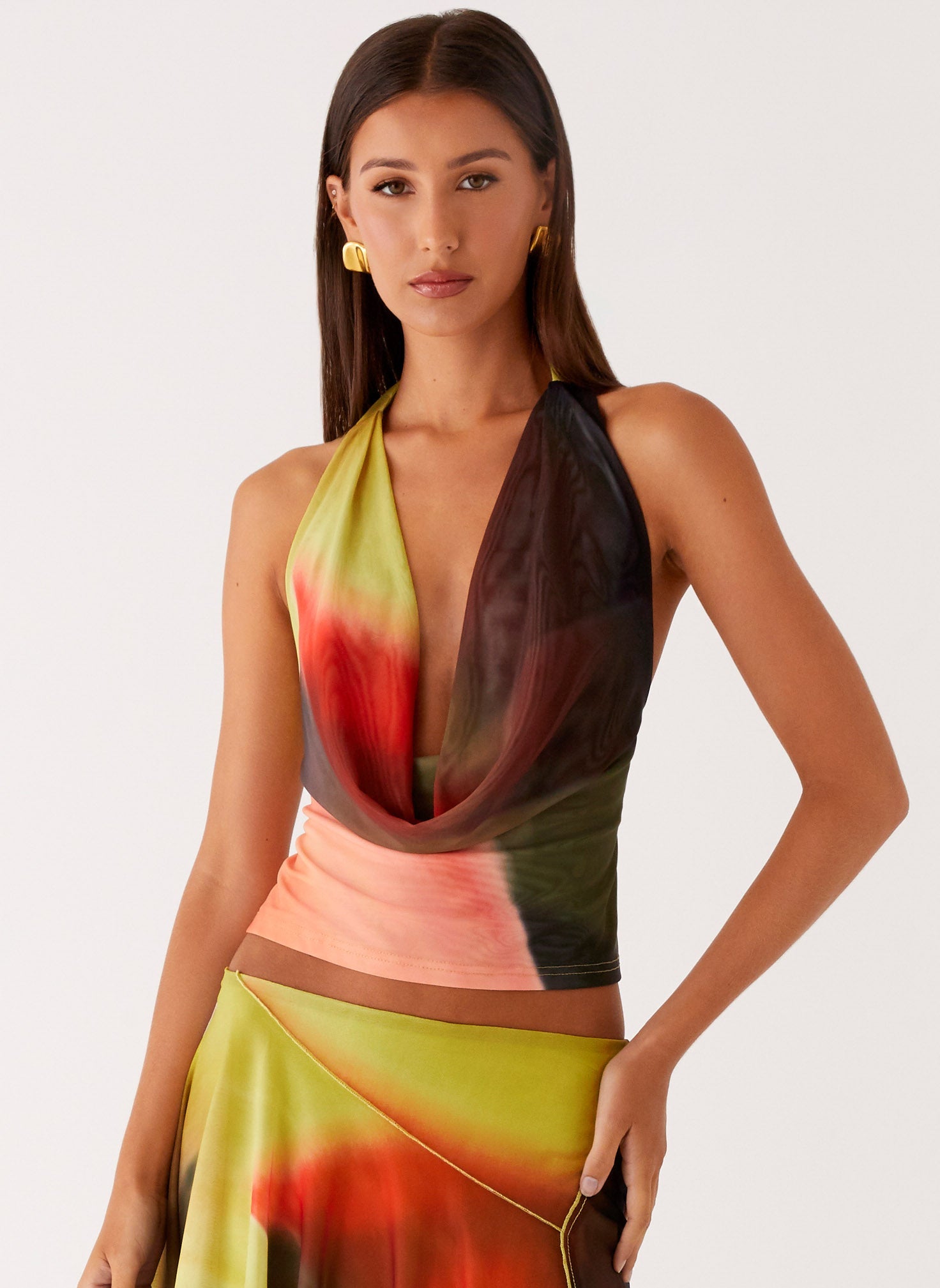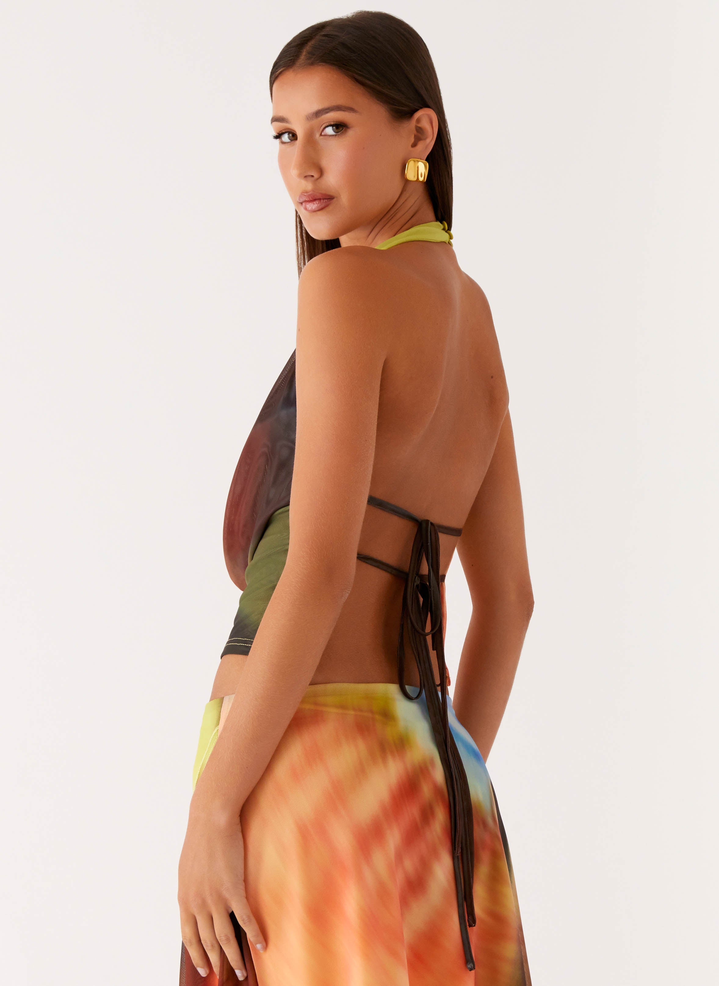 The Lustra Cowl Top shines with a low cowl halter neckline and long thin straps that tie at the back, revealing an open-back silhouette made for warm nights and city lights. Crafted from stretch mesh with an exclusive print, it features adjustable straps and a button closure for a perfect fit.