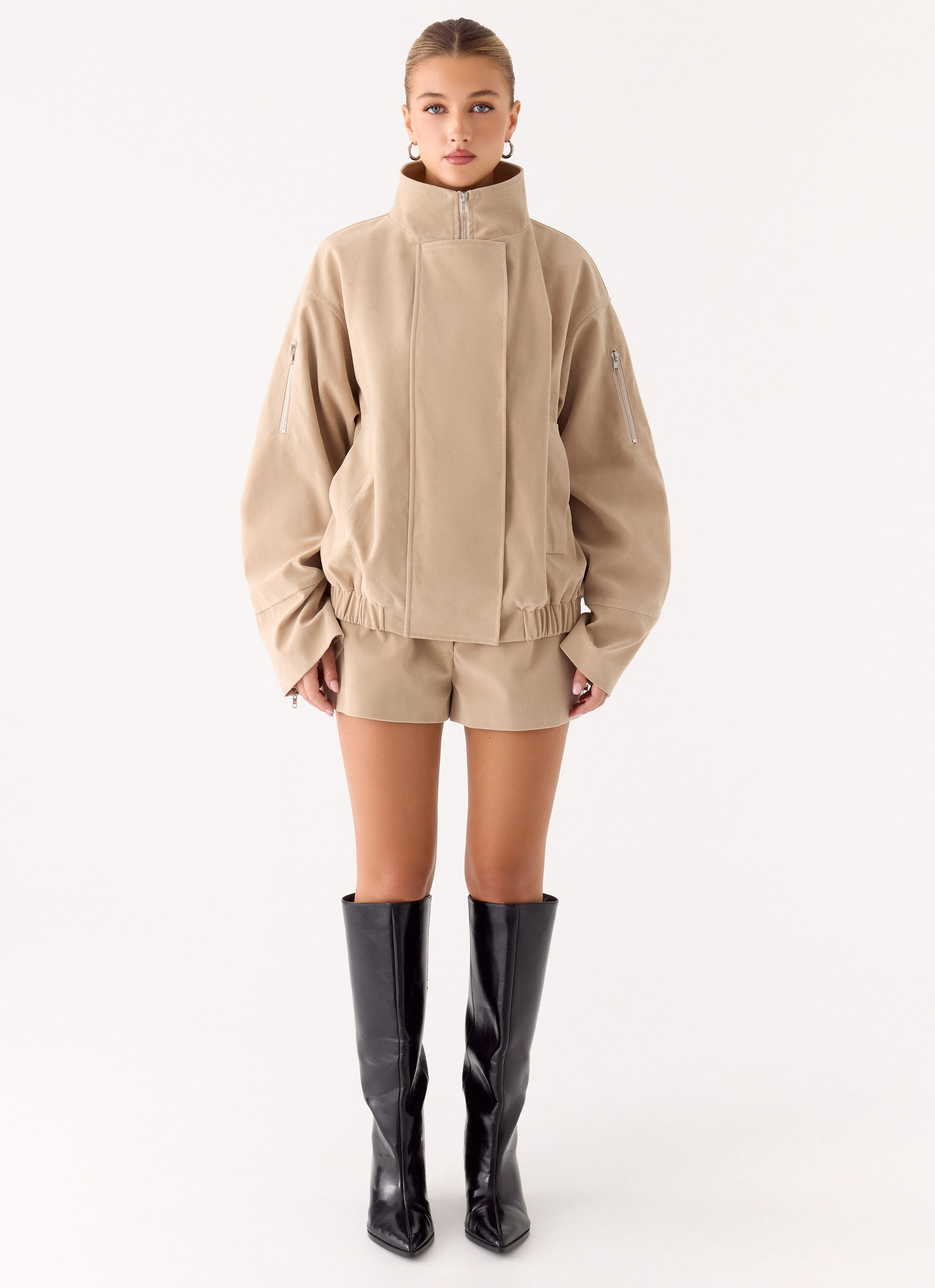 The Marlow Faux Suede Jacket is made for bold, statement layering. Featuring a high funnel neck and oversized silhouette, this fully lined jacket is crafted in soft faux suede for both style and comfort. With functional details like a hidden front zipper under a snap placket, side welt pockets, and sleeve zippers, it’s perfect for elevating casual and evening outfits alike.
