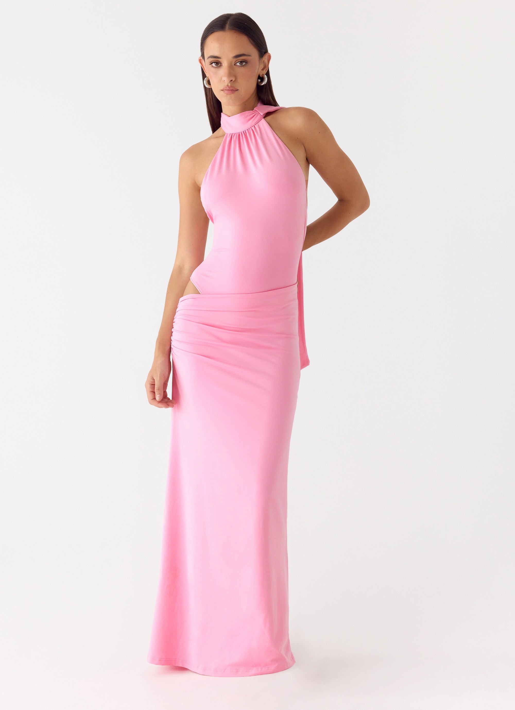 The On My Way Bodysuit Maxi Dress is made for nights that stretch from golden-hour glow into after-dark allure. Featuring a high halter neckline and low back, this maxi-length silhouette is crafted in stretch jersey with a flattering bodysuit and subtle side cut-out for effortless movement. Sleek, confident, and designed to turn heads with every step.