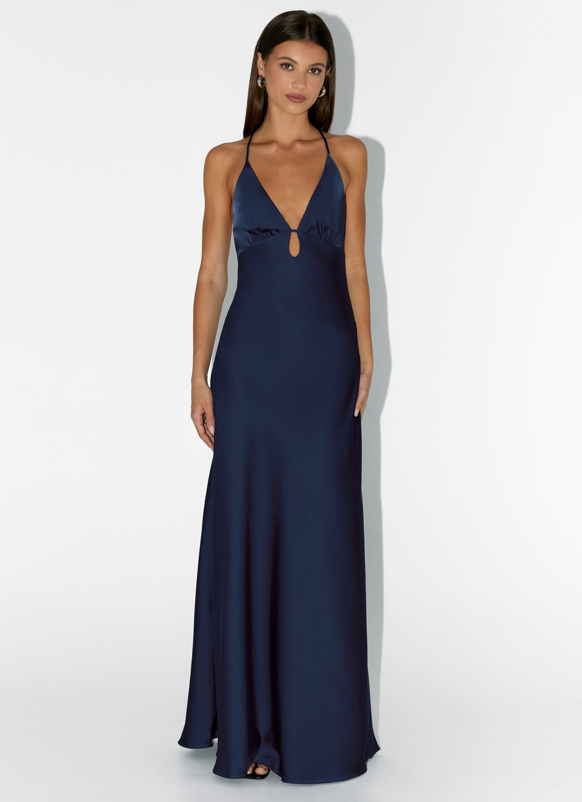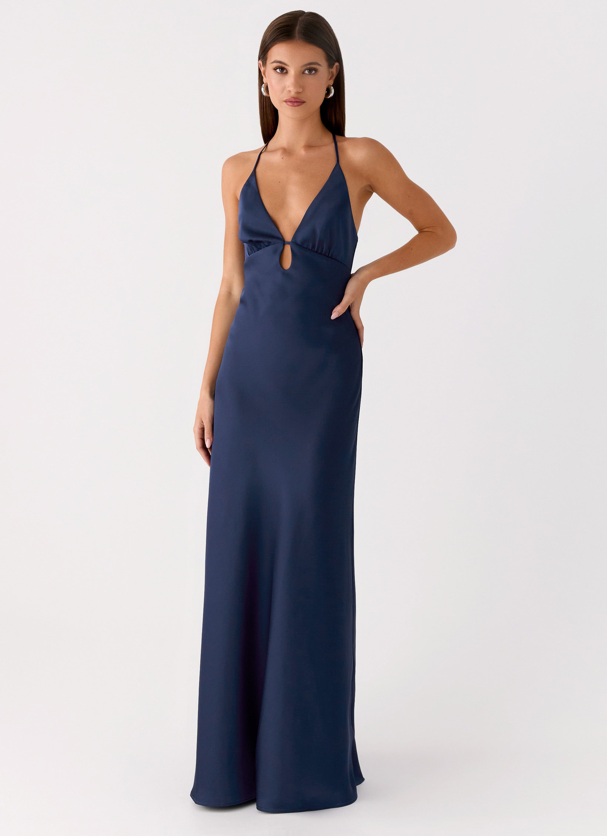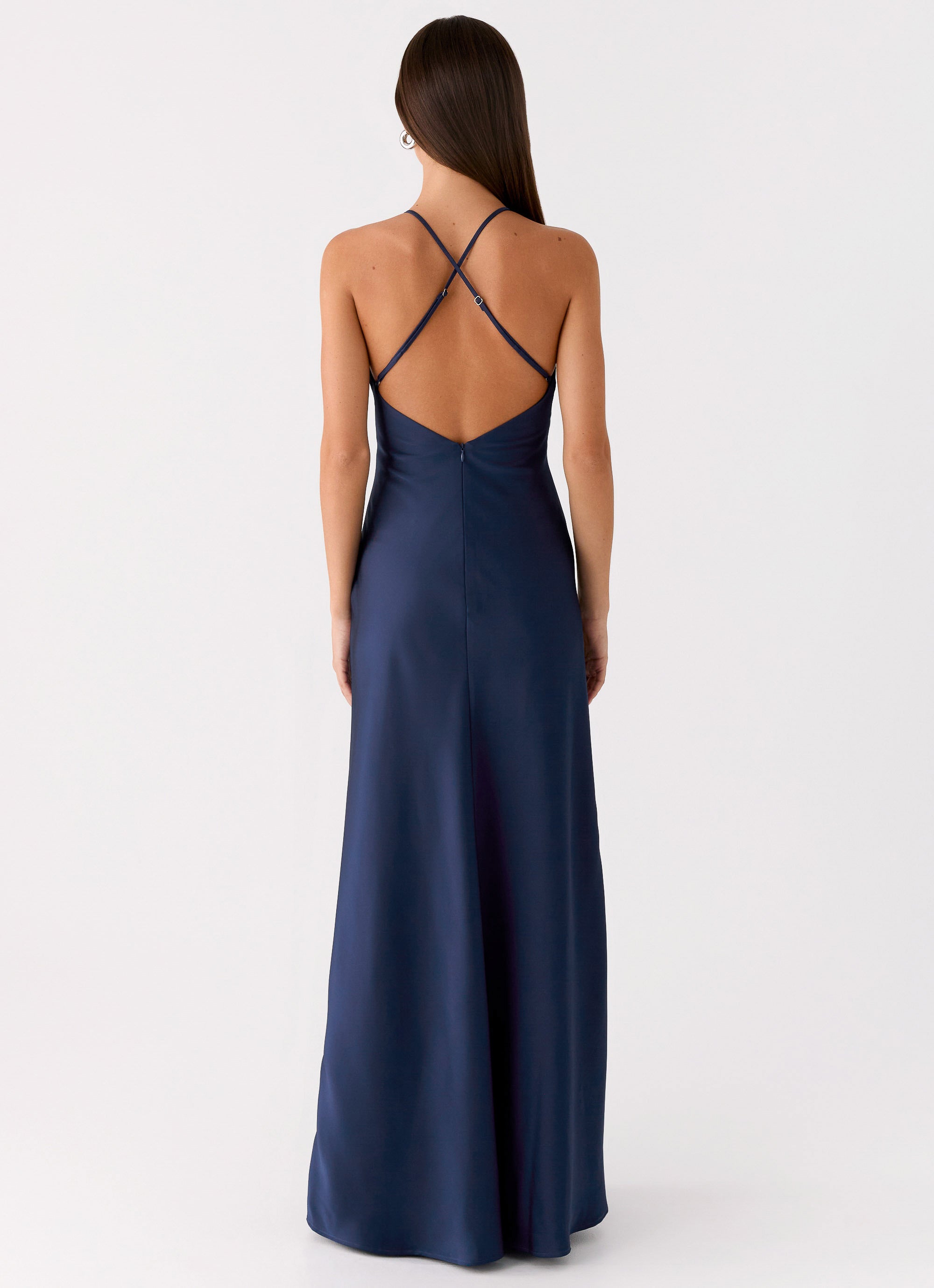 The Sundowner Maxi Dress is made for evenings that linger in the glow of the sunset. Crafted from a luxe satin in a sophisticated deep navy, this silhouette features a flattering V-neckline and intricate ruched underbust detailing. With its sultry low back and elegant, long-fitting profile, it offers an effortlessly refined look perfect for beach-to-bar moments and golden hour soirées.