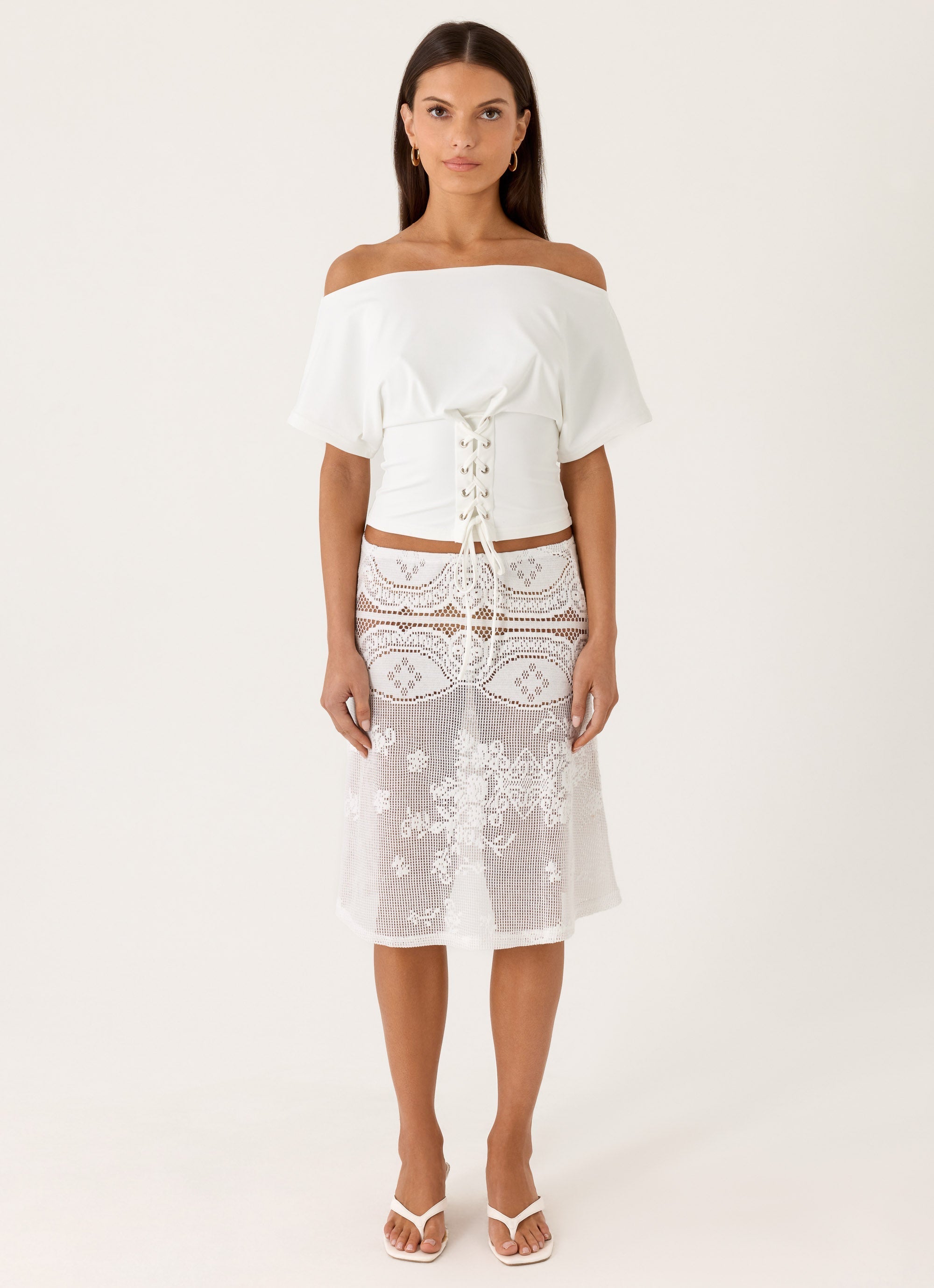 The Yanna Midi Skirt is made for golden hour moments that linger into balmy nights. Featuring a low-rise silhouette, elasticated waist, and delicate lace fabric, it drapes effortlessly with a flowing midi length for an easy, feminine feel. Perfect for sunlit strolls and evening escapes.